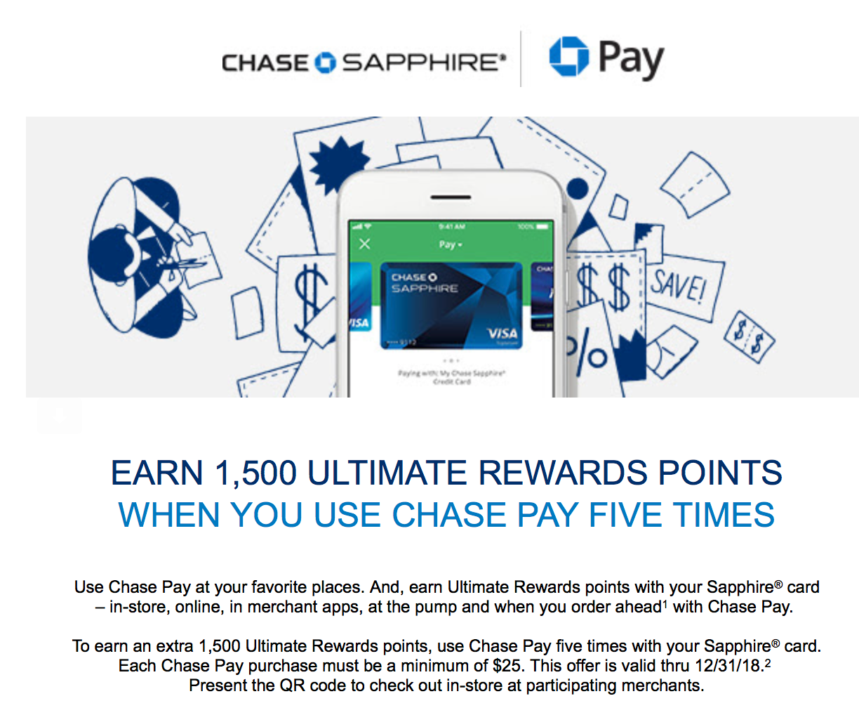 Just in time for the winter shopping season, Chase is offering a Chase Pay promotion. This promotion gives you 1,500 Chase Ultimate Rewards points if you use Chase Pay with a qualified card five times between October 1 and December 31, 2018. TPG's latest valuation pegs the value of these 1,500 points at $30.