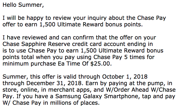 Some cardholders of the Chase Freedom (No longer open to new applicants), Chase Freedom Unlimited, Chase Sapphire Preferred Card and Chase Sapphire Reserve have reported receiving the offer by email. But, you might be eligible even if you didn't receive an email. In the past, similar promotions have been widely available for all cardmembers regardless of whether you received an e-mail. If you didn't receive an email offer, you can reach out to Chase via secure message to see if you're eligible. As you can see below, TPG's Mommy Points got the following via secure message when she asked whether her Chase Sapphire Reserve is eligible.