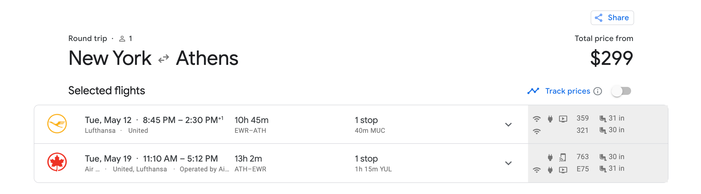 New York (JFK) to Athens (ATH) for $299 round-trip via Google Flights: