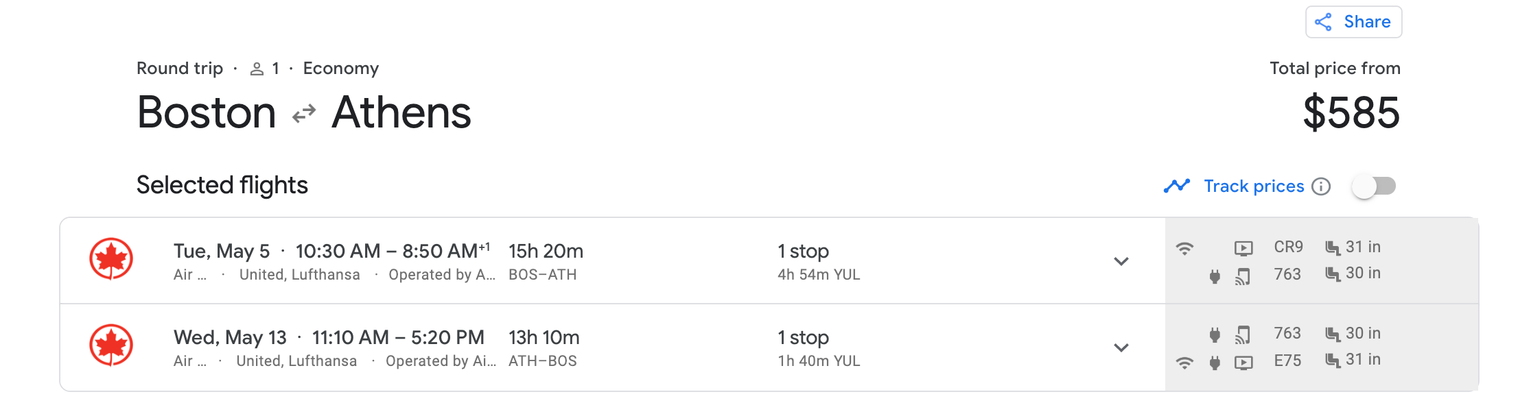 Boston (JFK) to Athens (ATH) for $585 round-trip via Google Flights: