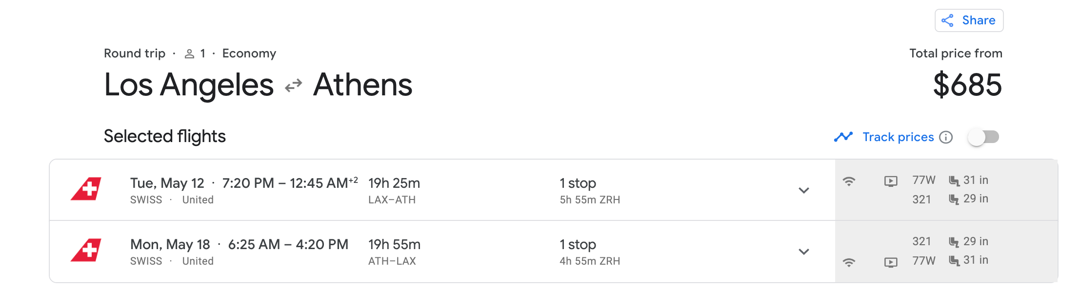 Los Angeles (LAX) to Athens (ATH) for $685 round-trip via Google Flights: