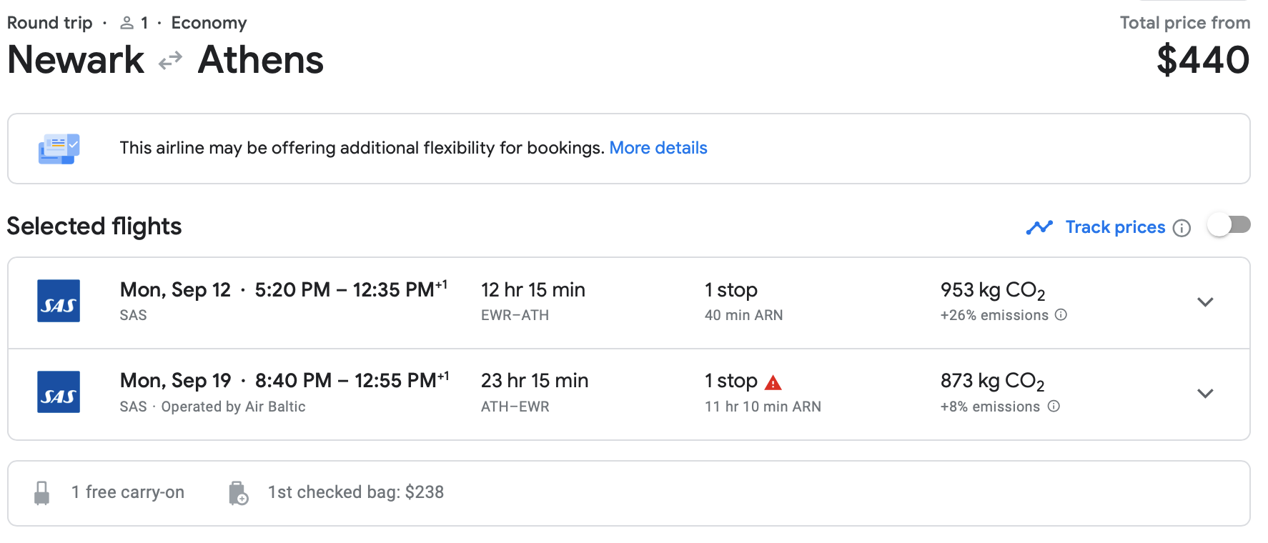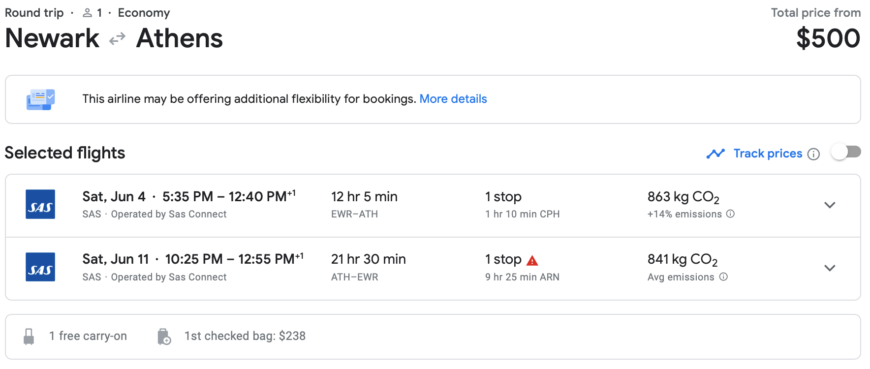 We found a fantastic deal from Newark Liberty International Airport (EWR) to Athens International Airport (ATH) in June on SAS (a Star Alliance member). An economy seat was only $500, which is half what this ticket usually sells for. You get a free carry-on bag, and it pays to travel light on this fare, since the first checked bag is $238.