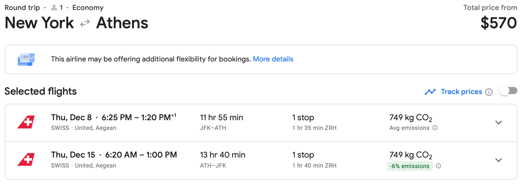 If you prefer to fly out of New York's John F. Kennedy International Airport (JFK), you can book an economy ticket to Athens in December for $570 round-trip on Swiss.
