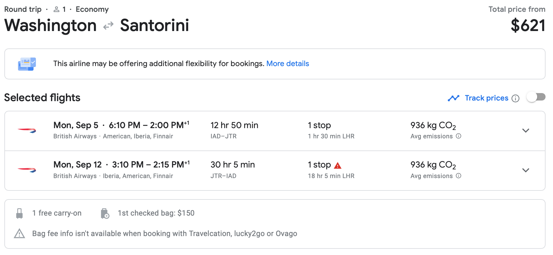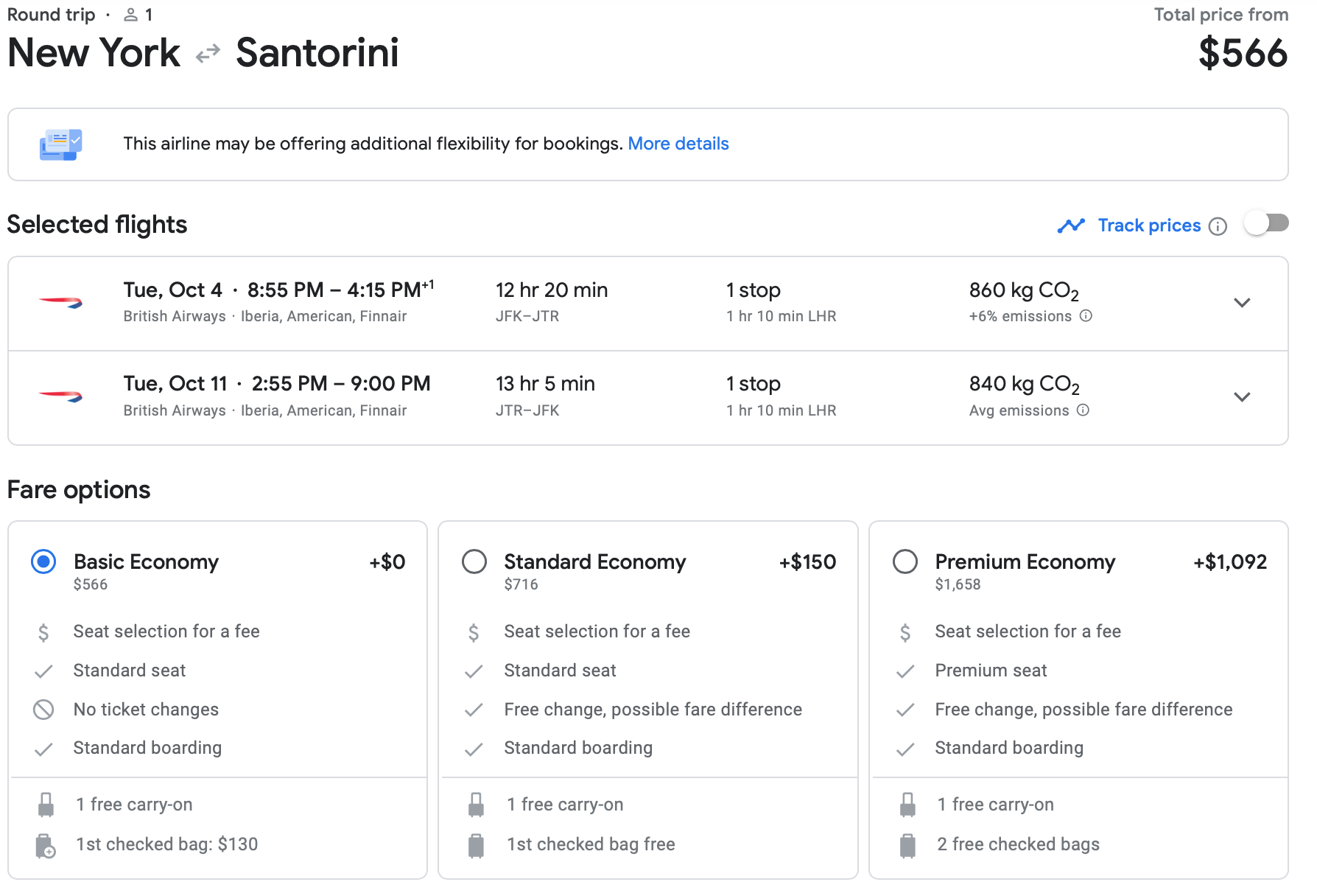 British Airways has flights from JFK to Santorini Airport (JTR) in October for just $566 round-trip, with a brief stop in London. It's a basic economy fare which means no seat selection, but you do get a free carry-on. A checked bag will cost you $130, which is almost the same price as upgrading to a standard economy ticket.
