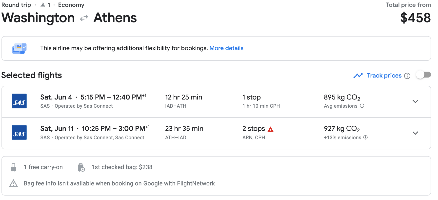 Flights from Dulles International Airport (IAD) to Athens are greatly discounted in June. We found this itinerary for only $458 round-trip, which is almost $600 cheaper than normal prices. Keep in mind the return flight involves two stops. Again, this is the SAS economy tier, which means checking a bag will cost you $238.