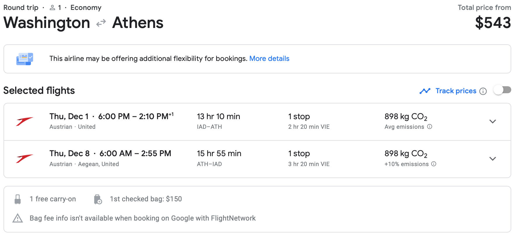 This itinerary is the absolute best deal we found for a flight to Athens: A December ticket on Star Alliance member Austrian Airlines (tickets sold by United) can be booked for $543, which is almost $1,000 cheaper than this fare usually costs. The departure is an overnight flight, and a checked bag will cost you $150, but considering how much you're saving on the ticket price, it may be worth it to check your luggage.