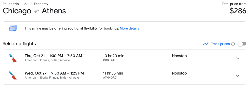 Flights can be found from three cities — New York, Philadelphia and Chicago — for less than $300, such as the below flight departing from Chicago in late October.