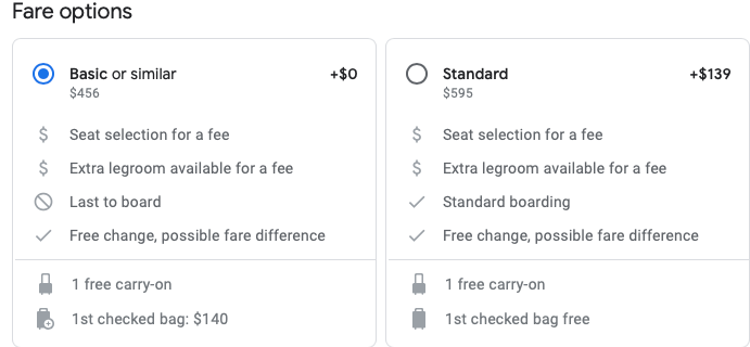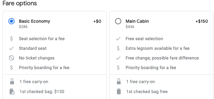 Because these are basic economy fares, checked baggage is not included. On American, it'll cost you $150 to do so, which is also the same price for an upgraded seat in the main cabin, which includes a checked bag and waived change fees.