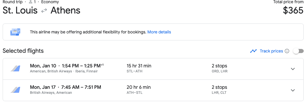 This one has two particularly excruciating layovers on both legs, but that's the price you pay for living in St. Louis I suppose (no shade, I was born and bred in St. Louis). Alternatively, if you prefer convenience over everything, you could price a flight from STL-ORD to take the aforementioned ORD-ATH deal. Direct flights from St. Louis to Chicago can be found for as little as $113 in January on Southwest, and around $150 on other carriers.