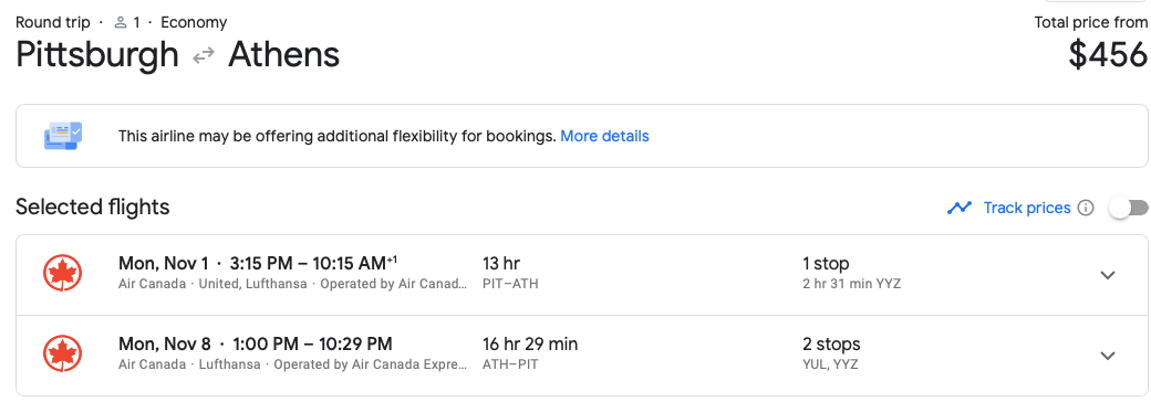 You can fly from over 20 cities to ATH for under $500, including this half-price flight for $456 from Pittsburgh to Athens that has just one relatively short layover on the way there.