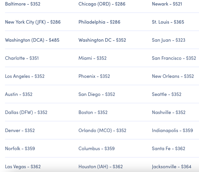 - Baltimore (BWI), starting at $352.
