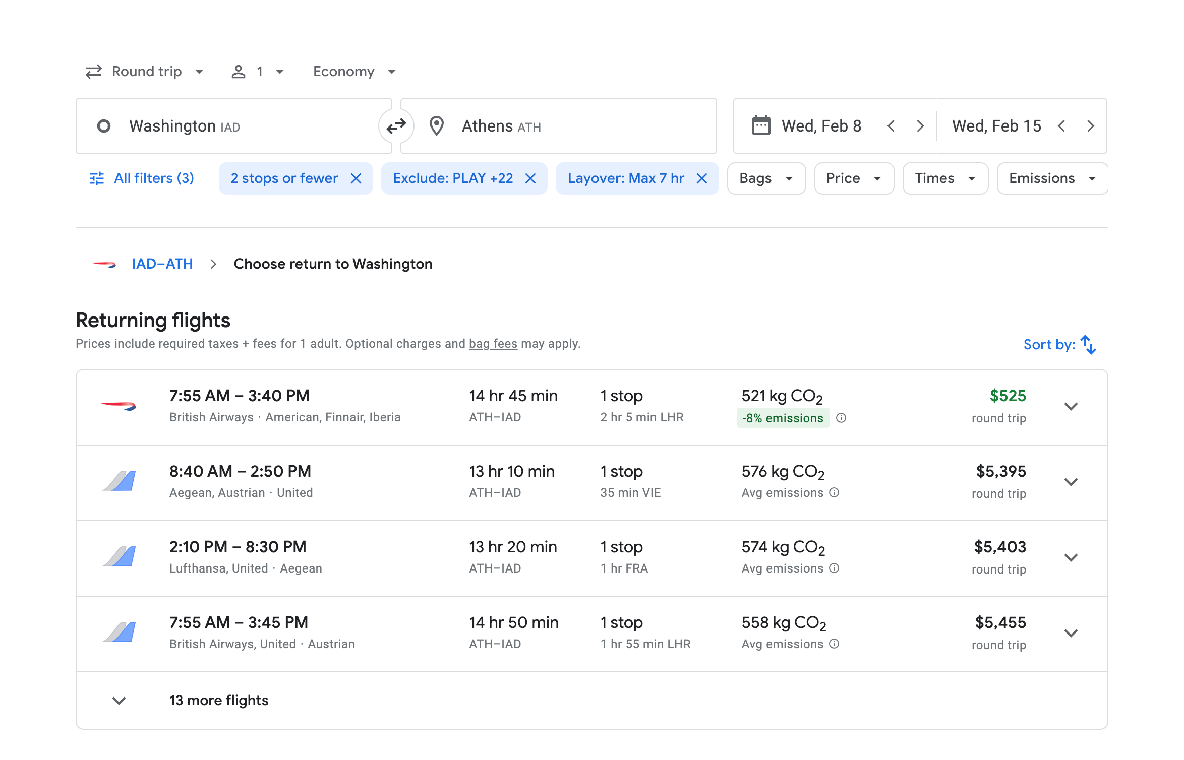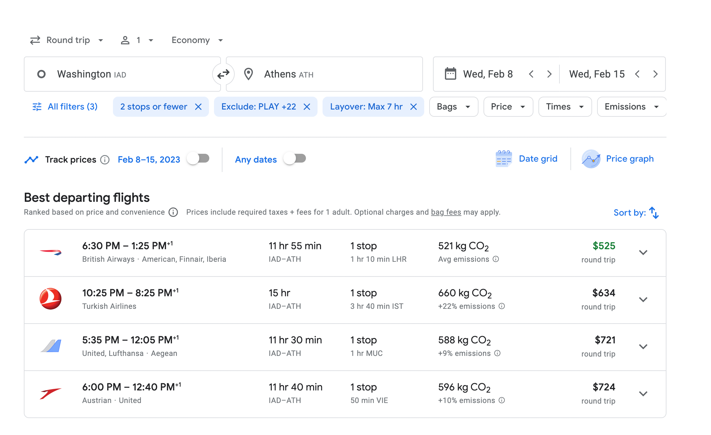 If you're in Washington, D.C., and want to go to Athens in February, a $525 British Airways flight at 6:30 p.m. is the cheapest option available on Google Flights.