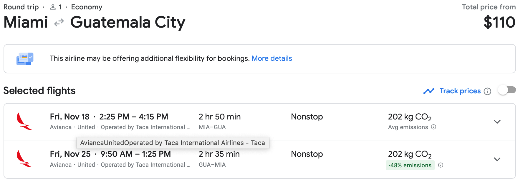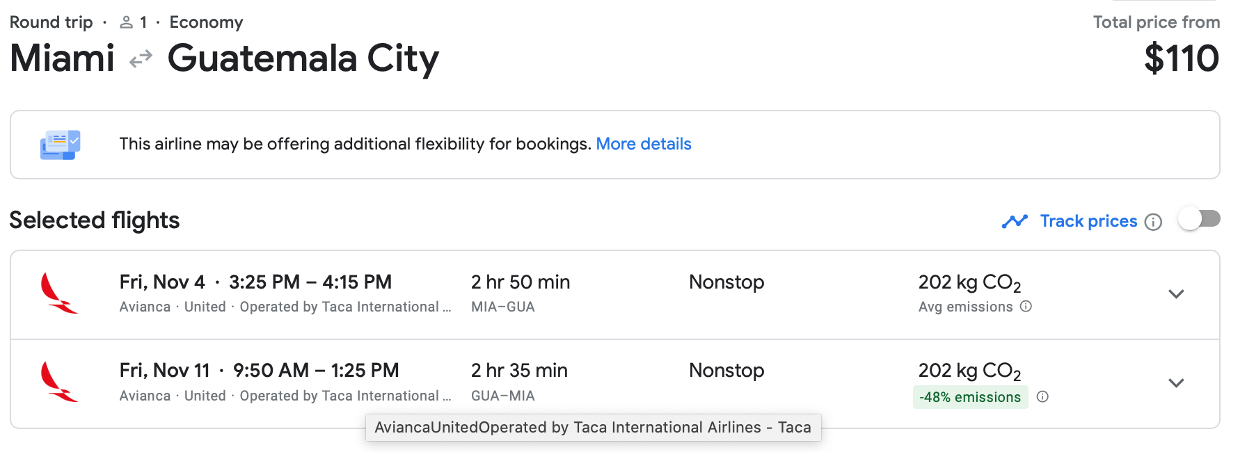 If you prefer to stay home for the holidays, you can book the same great fare earlier in November from Miami to Guatemala City.