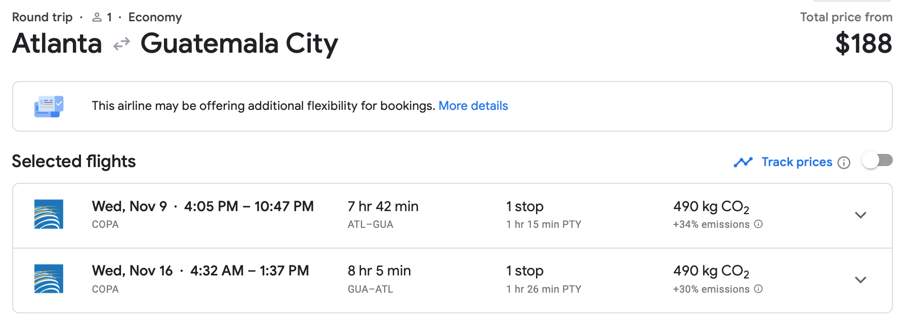 You can fly from Hartsfield-Jackson Atlanta International Airport (ATL) to Guatemala City in November on Copa Airlines for only $188 round-trip. This itinerary includes a layover in Panama City each way.