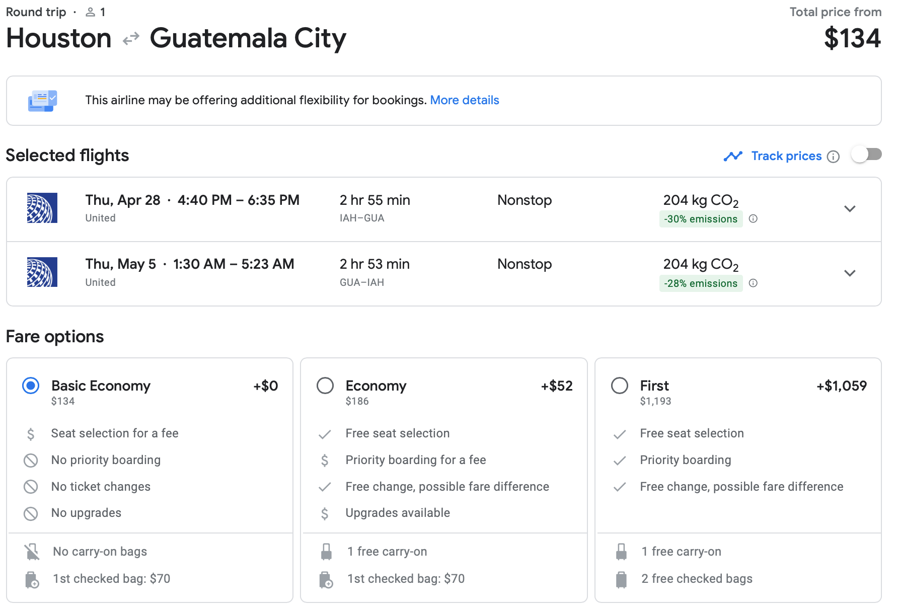 You can nab a ticket for a nonstop flight on United to Guatemala City from Houston's George Bush Intercontinental Airport (IAH) for travel at the end of April for only $134 round-trip. This is an excellent price for this route, and is more than 50% off normal prices. Keep in mind that this United fare doesn't allow a carry-on bag. Checking a bag will cost you $70, so consider upgrading to economy for just $52 and get the free carry-on option.