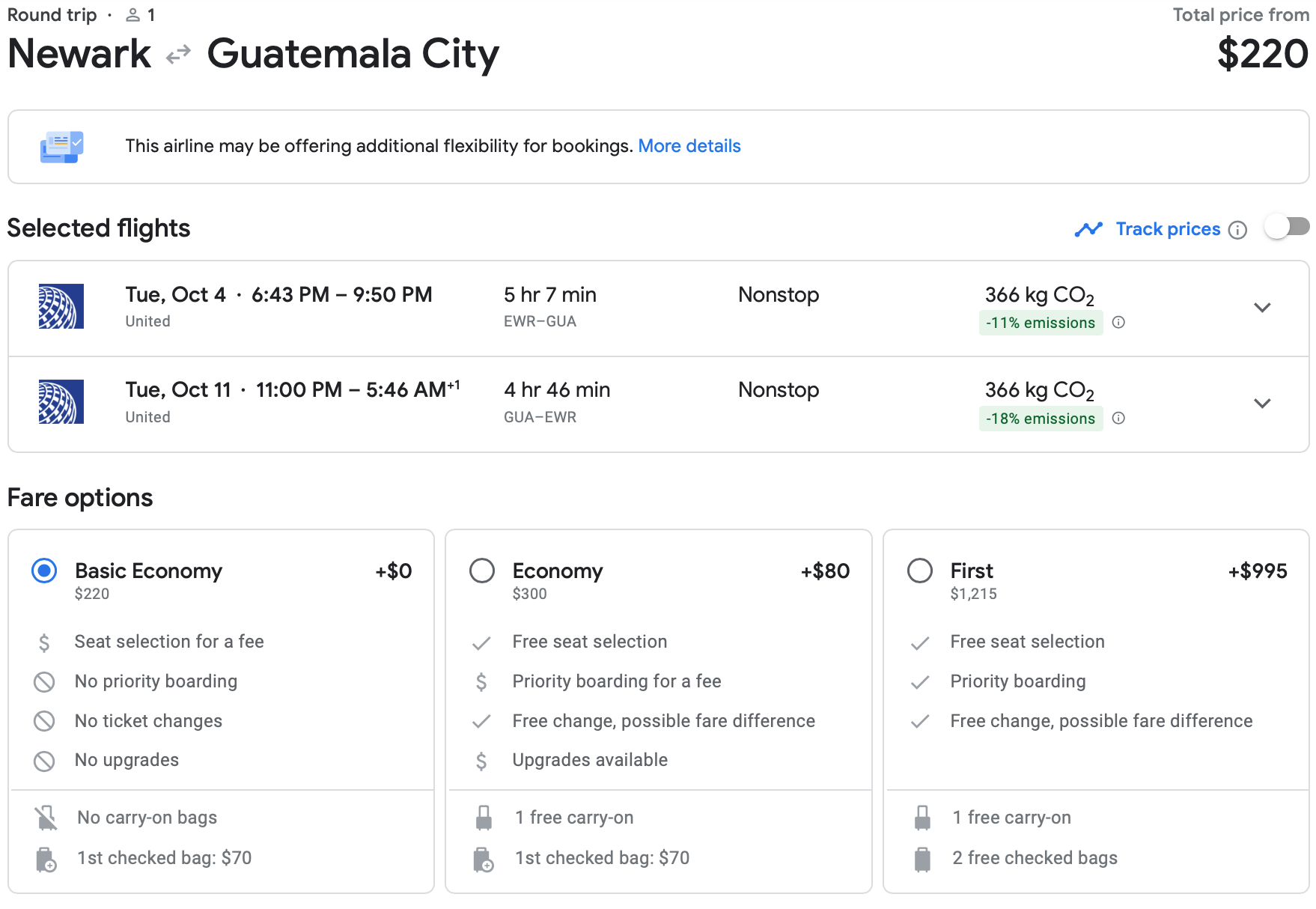 The same price will get you a ticket on a nonstop United flight out of Newark Liberty International Airport (EWR) to Guatemala in October. Again, it's United's most restricted fare, so keep in mind you'll have to pay $70 to check a bag.