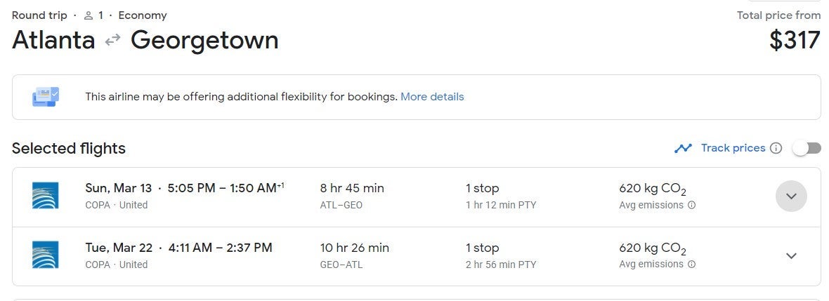 One of the most affordable deals is from Atlanta (ATL) to Georgetown (GEO) throughout March at $317 round-trip with a stop in Panama City each way on the Copa Airlines booking, which is on partner United Airlines.
