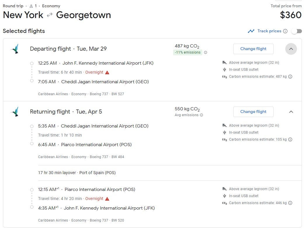 There is limited flight availability for Miami (MIA) to Georgetown (GEO) at $430 round-trip. We found the deal at the end of April on Caribbean Airlines with a layover in Port of Spain (POS) each way.