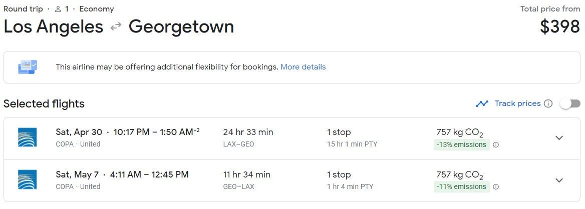 From the West Coast, there are flights available from Los Angeles (LAX) to Georgetown (GEO) for $398 round-trip on Copa Airlines for travel from the end of April to the beginning of May with a layover in Panama City.