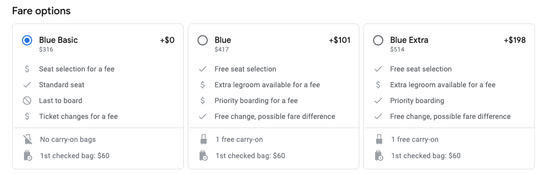 JetBlue's basic economy class, Blue Basic, does not include a full-sized carry-on. To access the overhead bin, consider upgrading to Blue or checking a bag for $60.