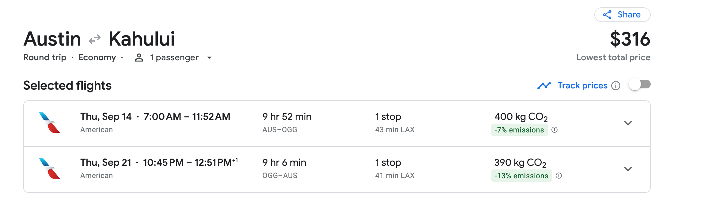 Consider the below flight from Austin to Maui on American Airlines. You could spend a week exploring the beaches, snorkeling and hiking to waterfalls for just $316. Note that the layover at Los Angeles International Airport (LAX) is on the shorter end of the spectrum. If you're worried about making such a quick connection or think you'll need assistance, select a flight with a longer layover.