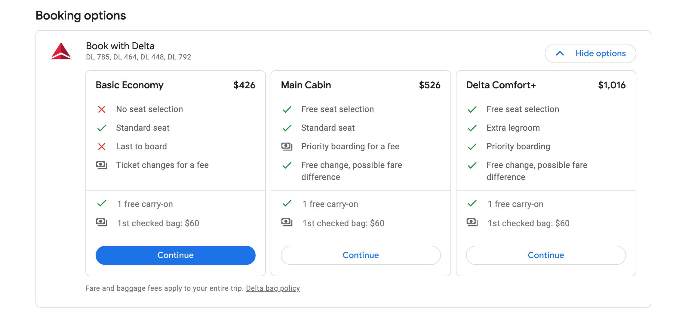 This rate applies to basic economy seats, which include one free carry-on bag. You'll pay $60 to check a bag. If you want to select your seat or change your flight free of charge, upgrade to a main cabin ticket. Even with the upgrade, the flight is still a good deal.
