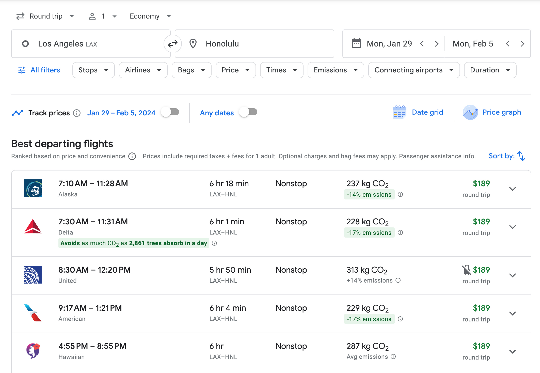 Since there are so many options, you can choose your flight based on departure time and airline, not just based on what is cheapest. For example, a Jan. 29 flight from Los Angeles International Airport (LAX) to Honolulu's Daniel K. Inouye International Airport (HNL) is $189 across the five different airlines.