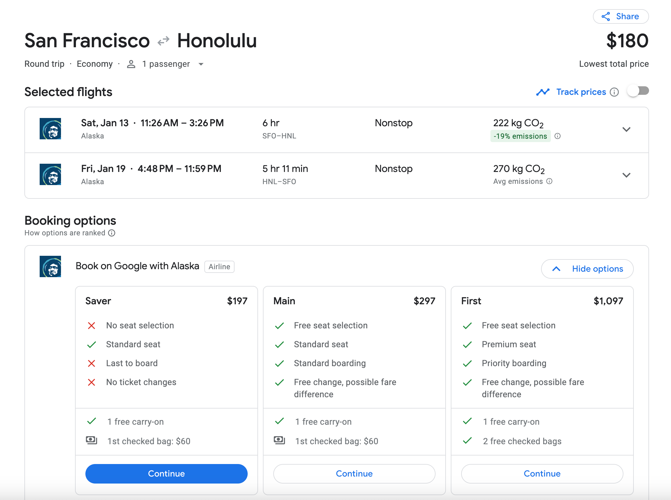 There are also inexpensive options from San Francisco International Airport (SFO). The below flight applies to Alaska's Saver fare, which comes with a carry-on bag but minimal other perks. Still, for a $180 round-trip fare, it's hard to beat.