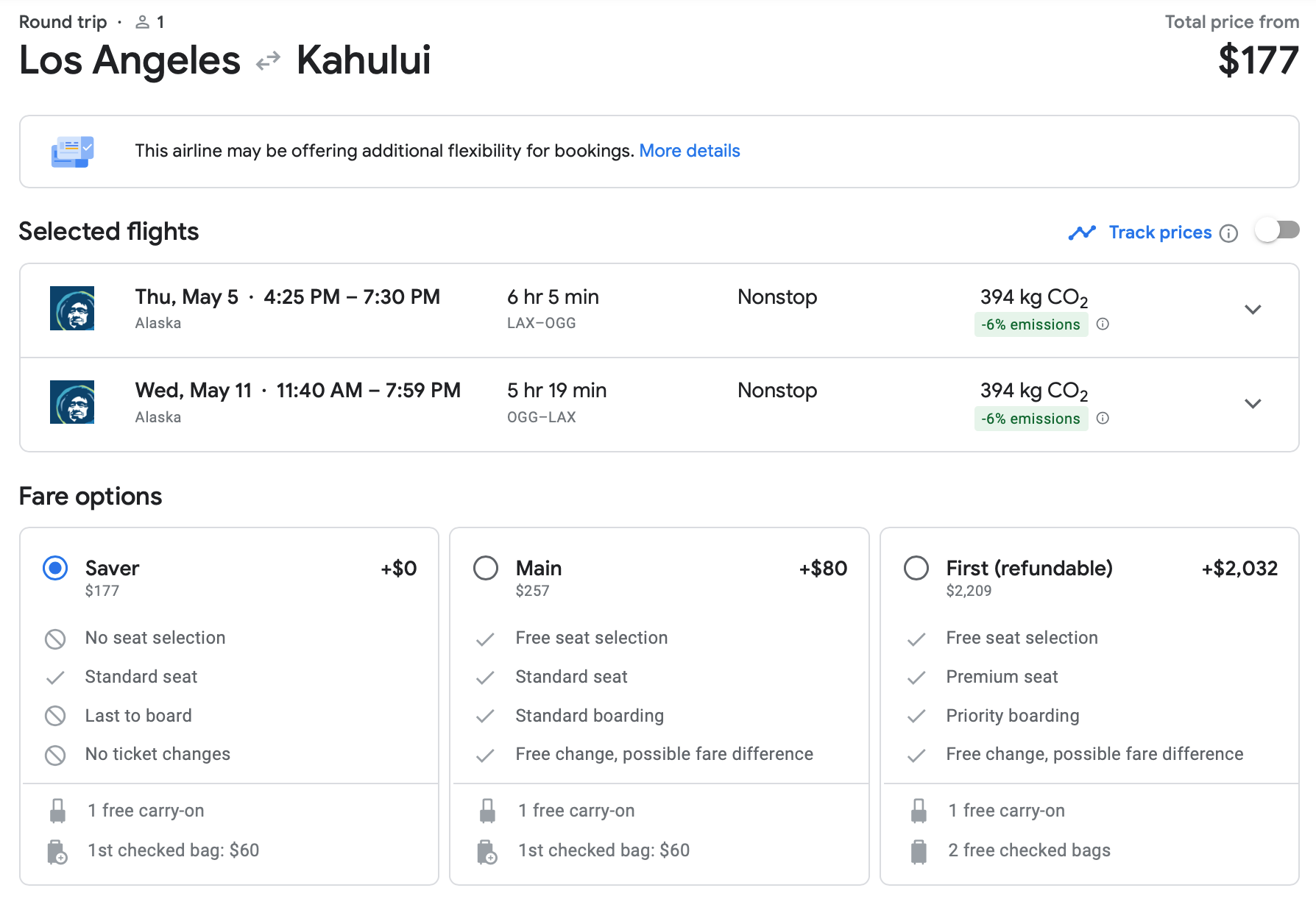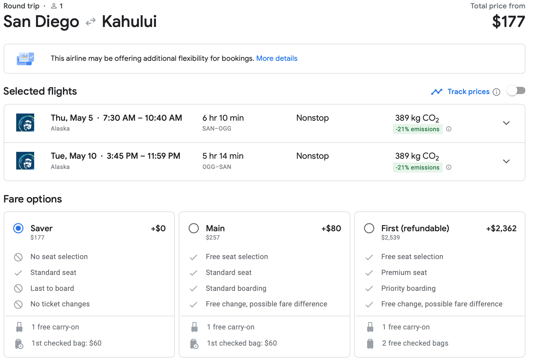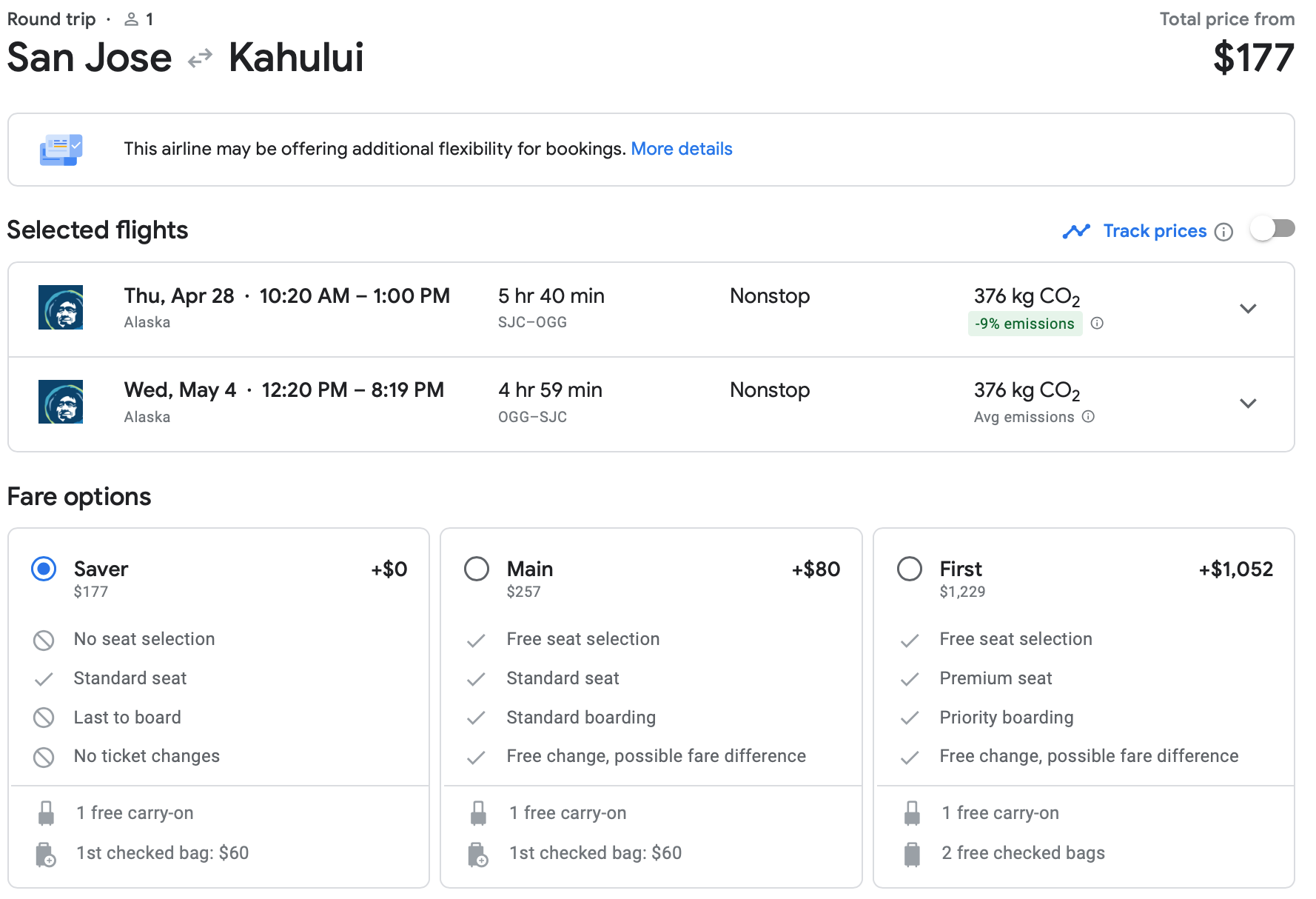 Book yourself a trip from San Jose (SJC) to Maui (OGG) for just $177 round-trip in late April. Notice that upgrading to Main Saver would cost you $80, but checking a bag with a Saver ticket is $60, so it may not be worth upgrading unless you really hate to board last.