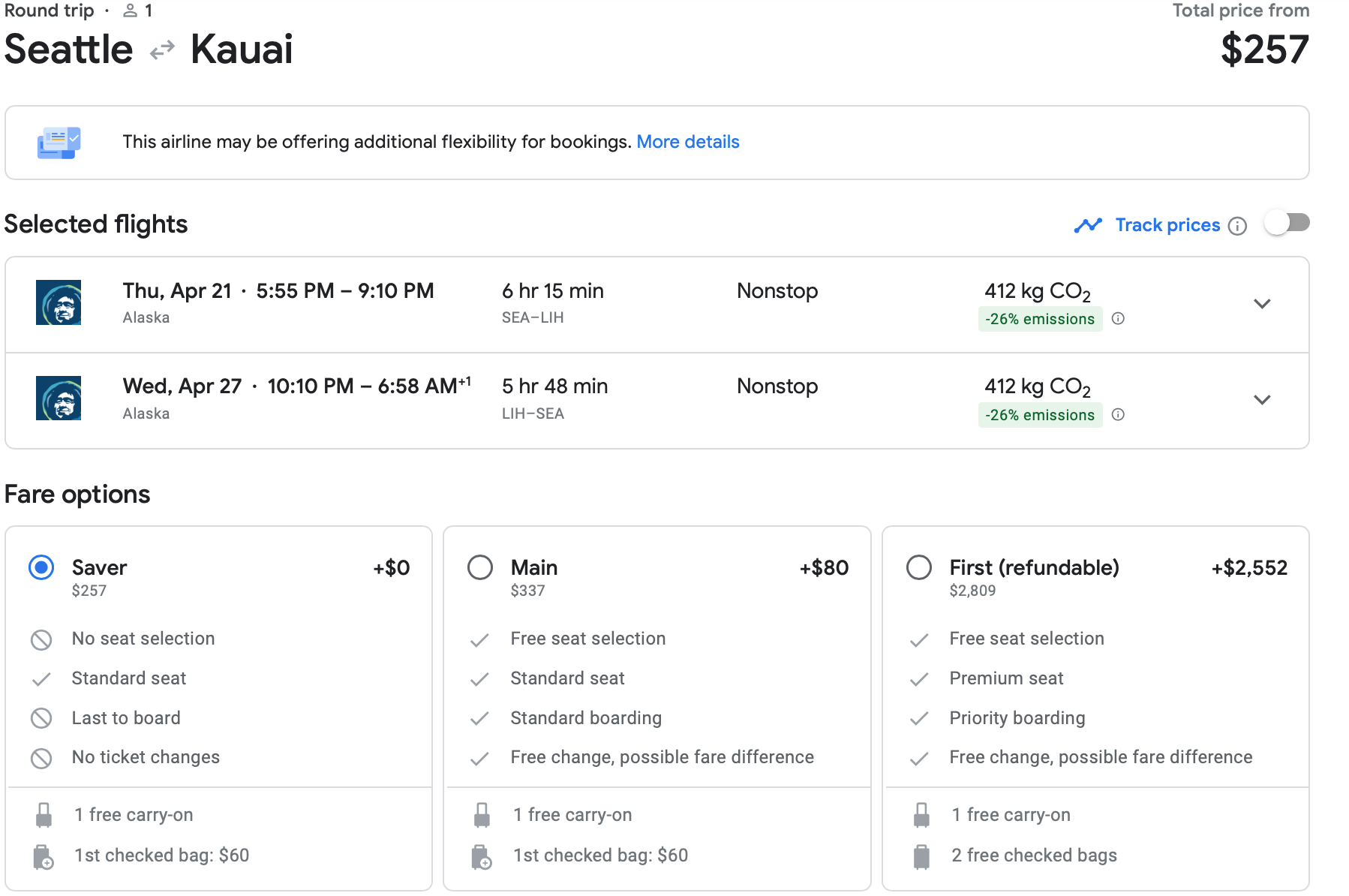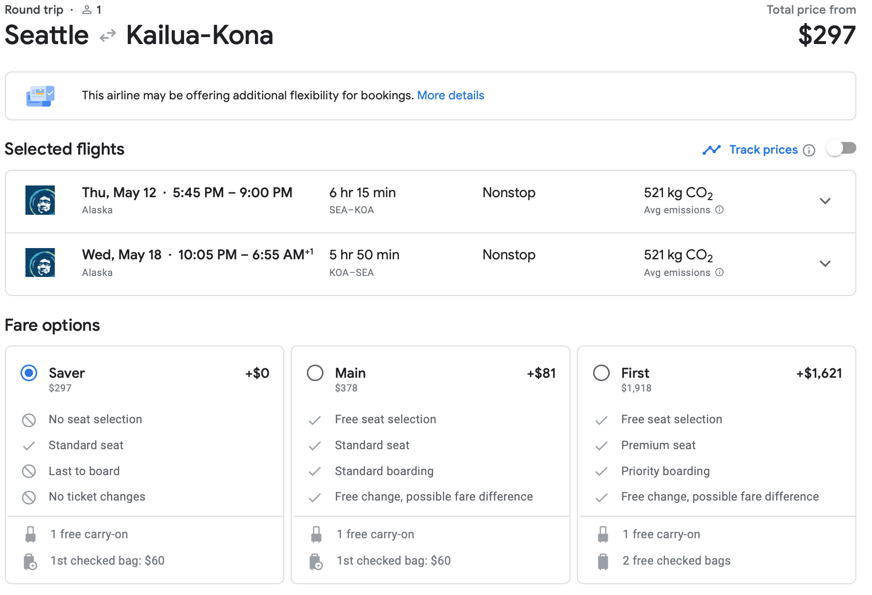 We found great prices on tickets from Seattle (SEA) to Kona (KOA) across the dates of this sale. This Saver itinerary for a mid-May jaunt to the Big Island costs you just $297, a great price for this route.