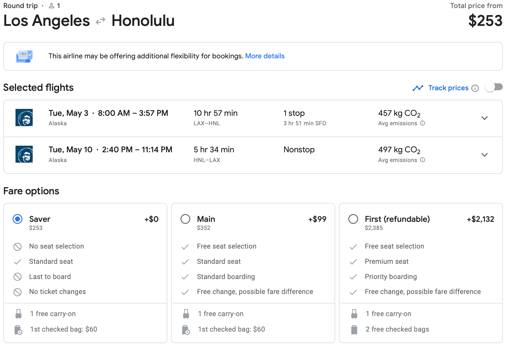 Los Angeles to Honolulu (HNL) is also significantly discounted in this sale. You can fly there for only $253 round-trip. Note that the departure flight out of LAX in this itinerary has one stop, but the return flight is nonstop.