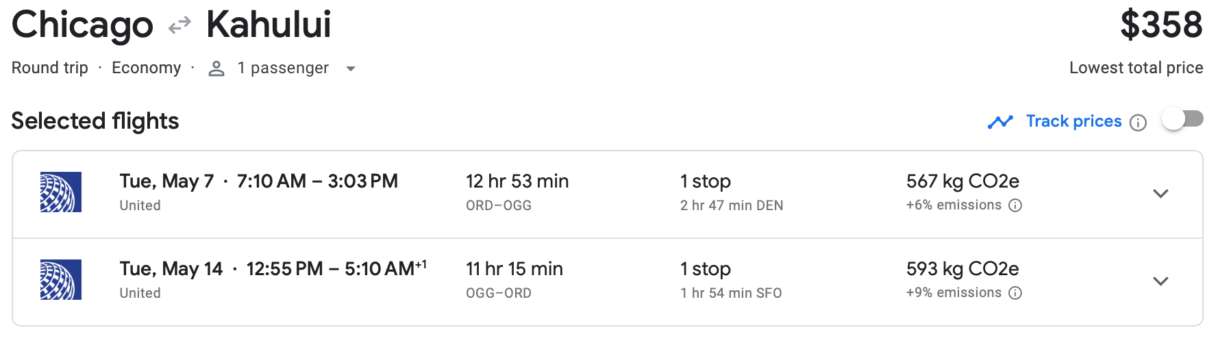 Another bargain we found out of Chicago was this round-trip option to Maui via United for only $358. This was another early May flight. For Chicago travelers, May was far and away the month with the best deals in this sale.