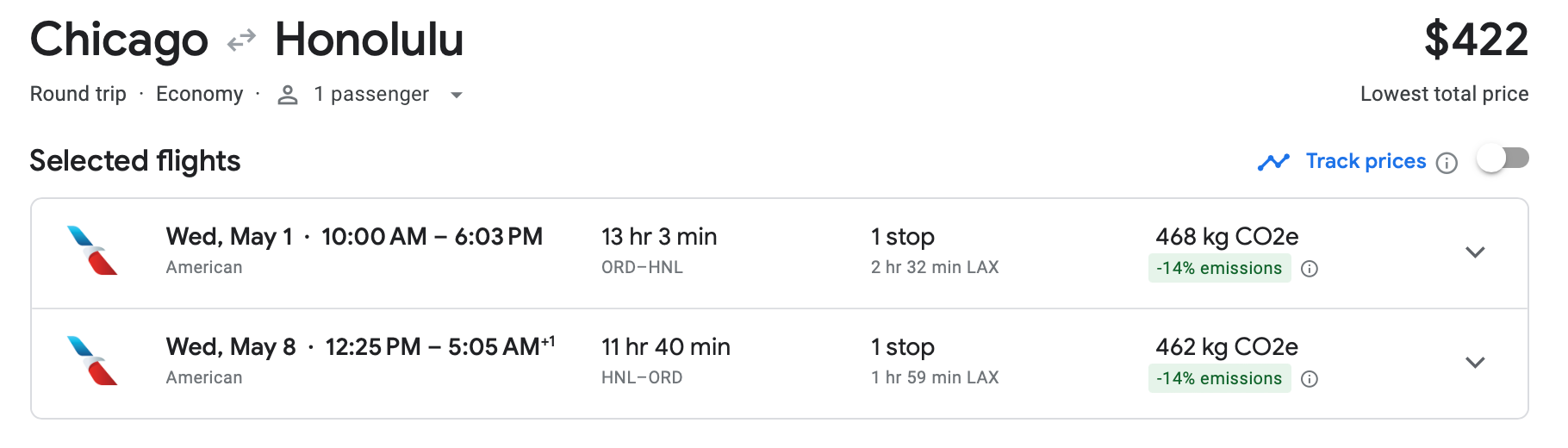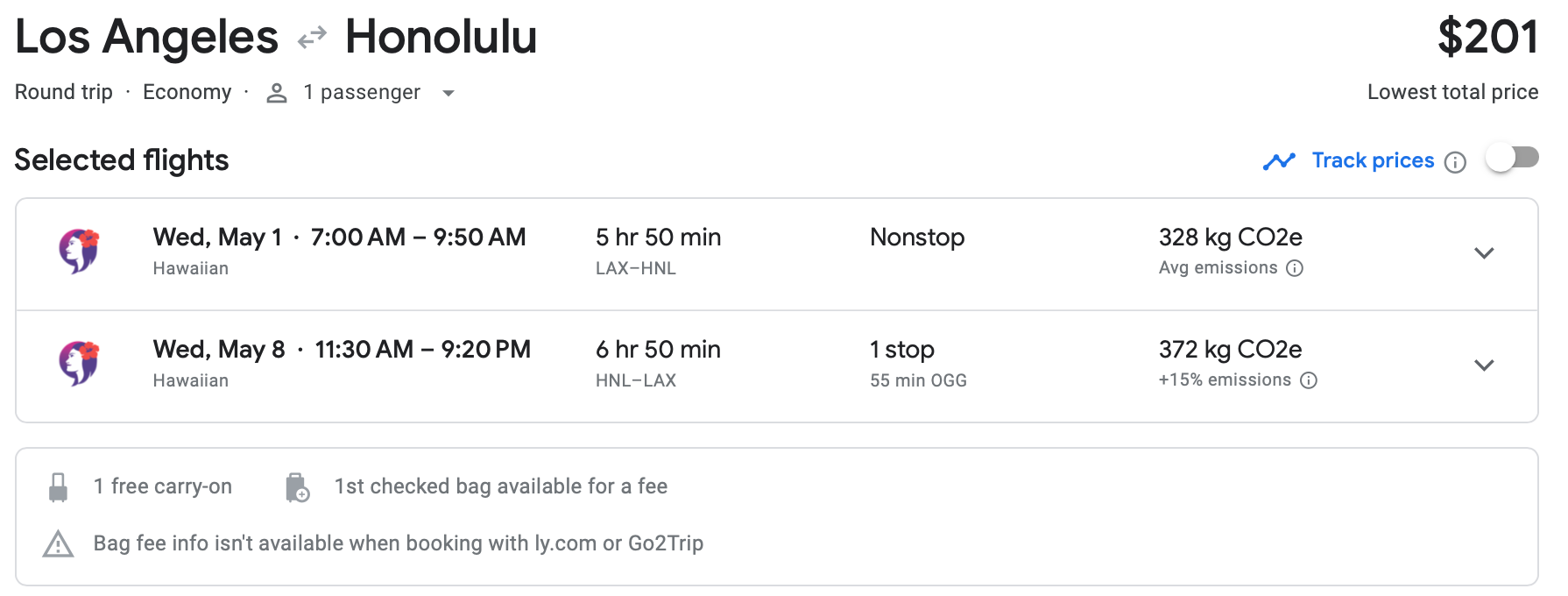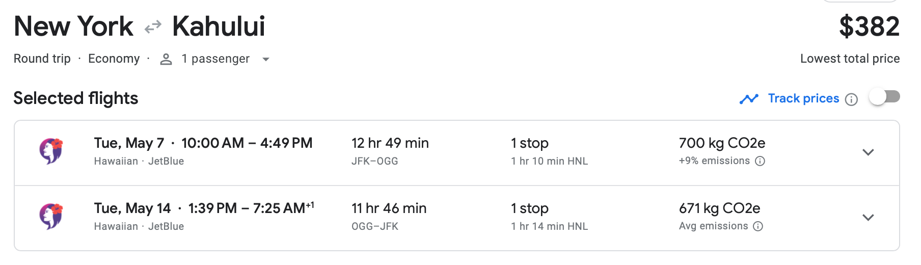 We'll end with this Hawaiian Airlines itinerary from New York City's John F. Kennedy International Airport (JFK) to OGG in May. The total cost for this round-trip option, which comes with a free carry-on bag, is only $382.