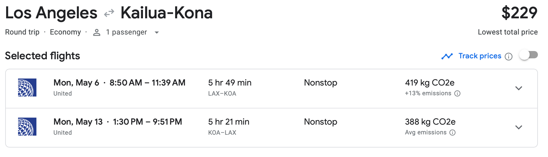 A flight from LAX to Ellison Onizuka Kona International Airport at Keahole (KOA) on the Big Island is also available on United in May for $229 round-trip. This was easily the month where we saw the best prices and availability for flights out of Los Angeles.