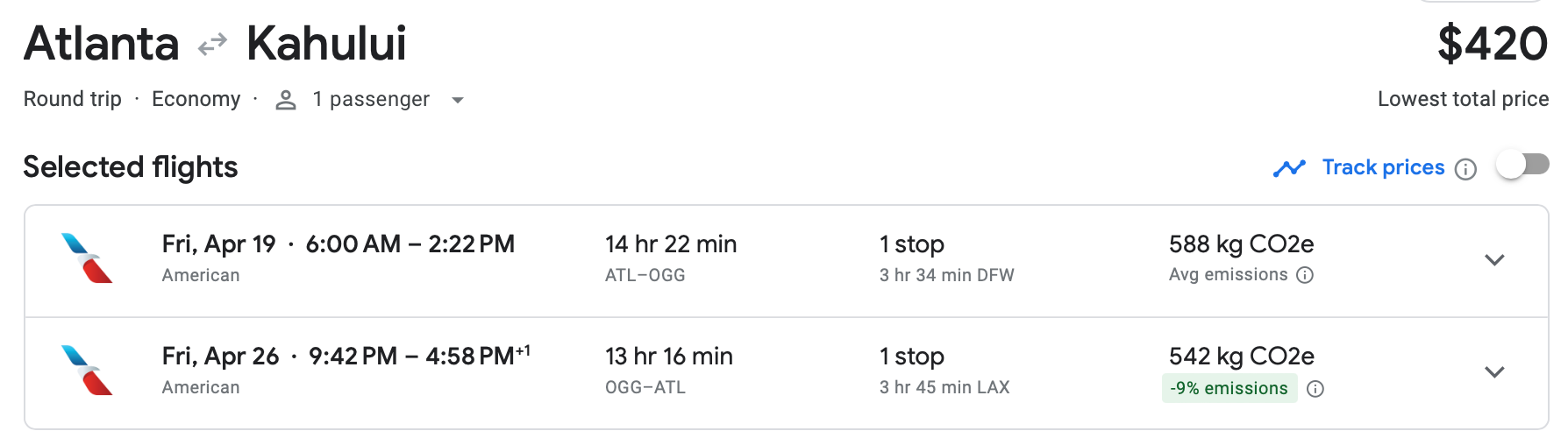 We found some excellent prices for flights out of Atlanta, too. If you can free up your schedule in late April, you can book a round-trip itinerary on American from Hartsfield-Jackson Atlanta International Airport (ATL) to OGG for $420. This is a huge markdown from what this route typically costs. While there's a layover each way, considering the savings, we think it's still worth booking.