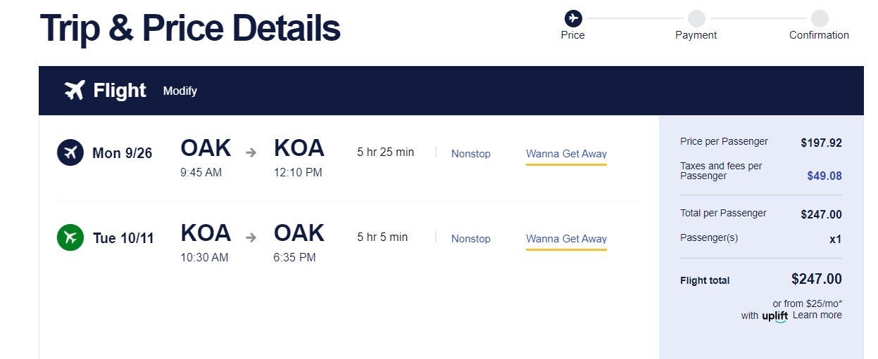 From late September through October, you can find Southwest flights beginning at $247 round trip from Oakland to the Kona International Airport (KOA) on the Big Island of Hawaii.