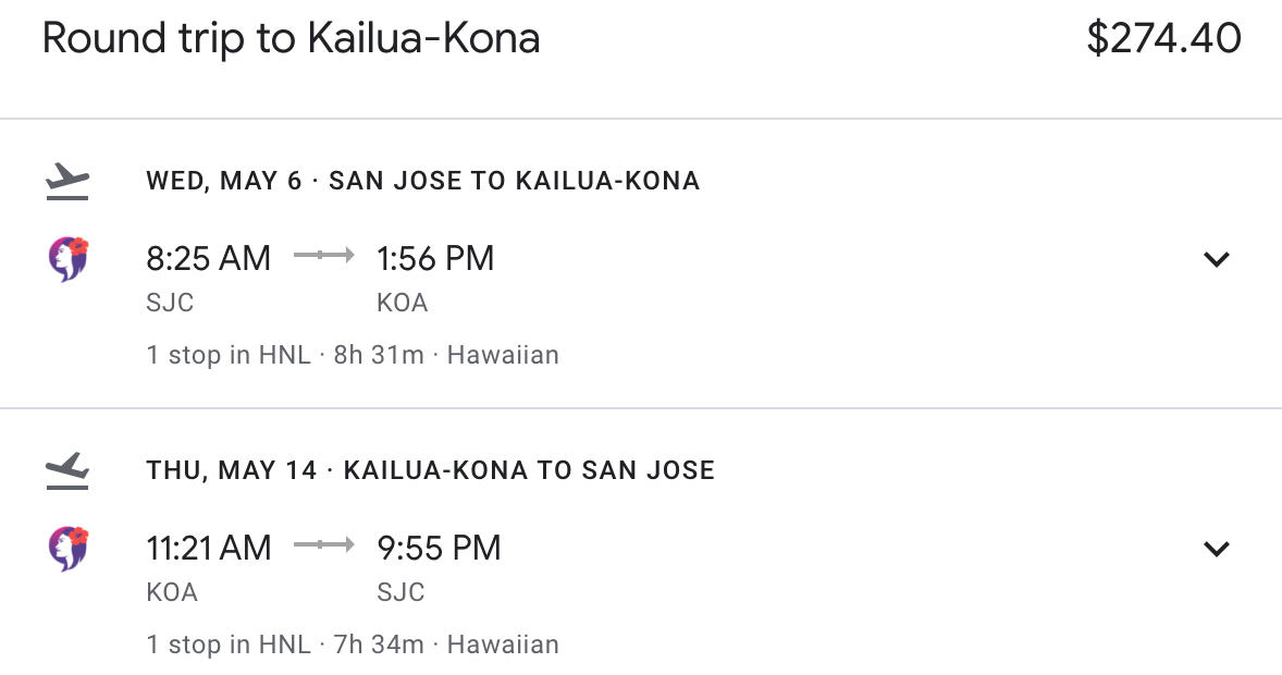 San Jose (OAK) to Kona (KOA) for $274 round trip nonstop on Hawaiian via Google: