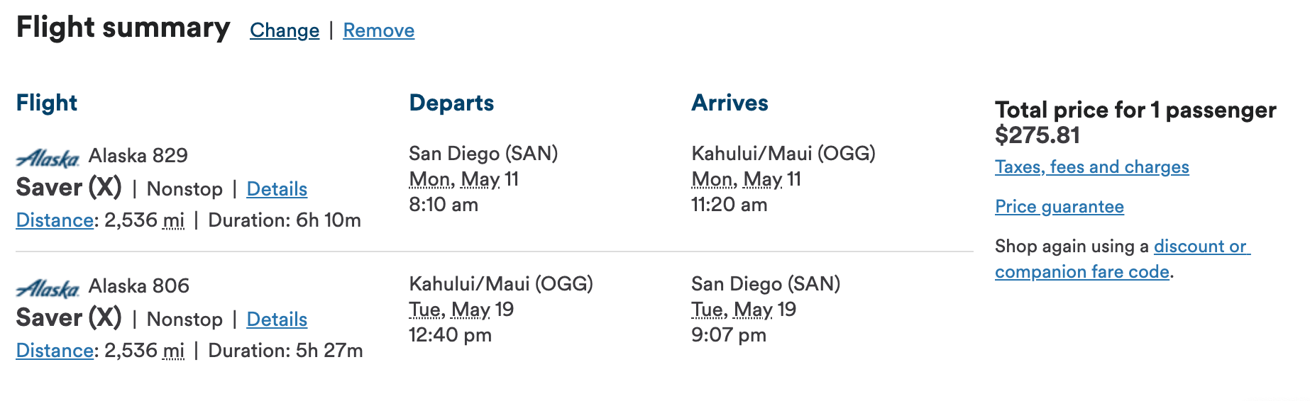 San Diego (SAN) to Maui (OGG) for $276 round trip nonstop on Alaska: