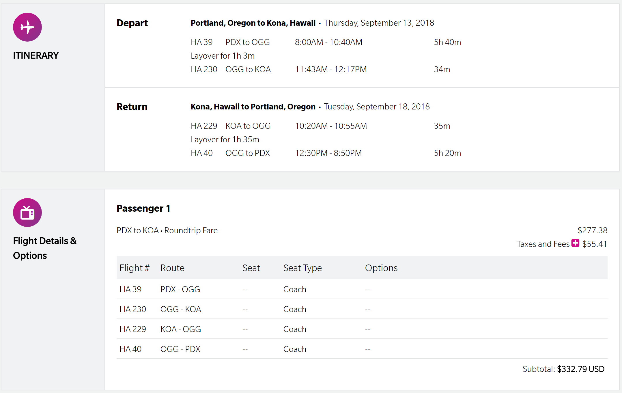 Portland (PDX) to Kona (KOA) in September for $333 round-trip on Hawaiian: