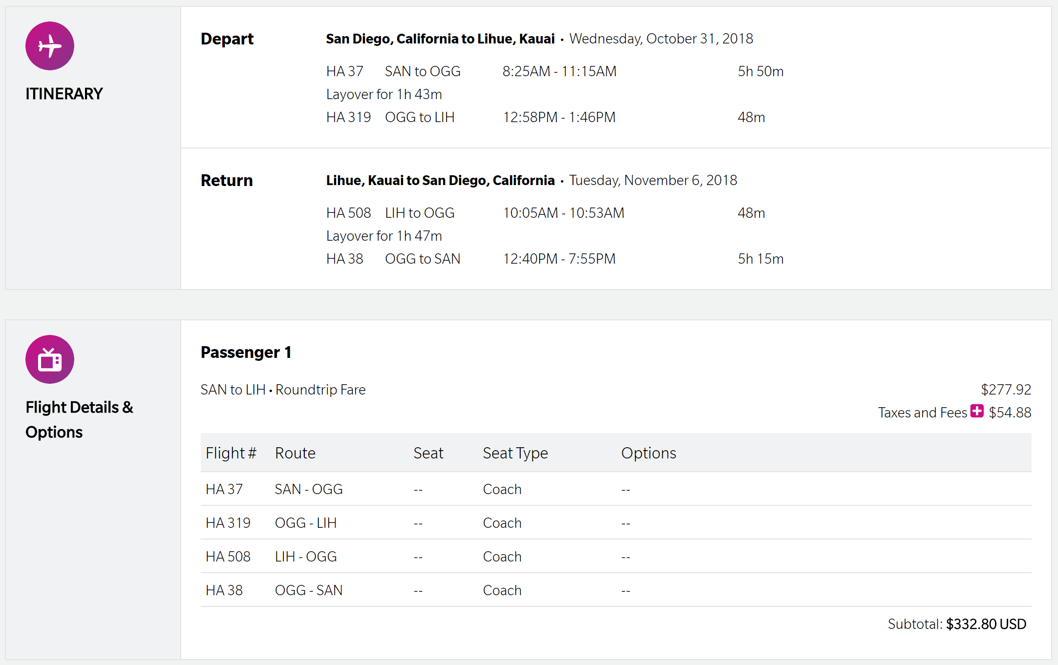 San Diego (SAN) to Lihue (LIH) in October/November for $333 round-trip on Hawaiian: