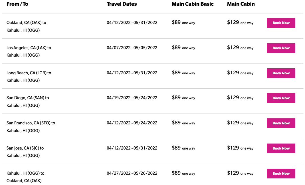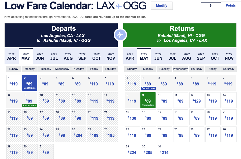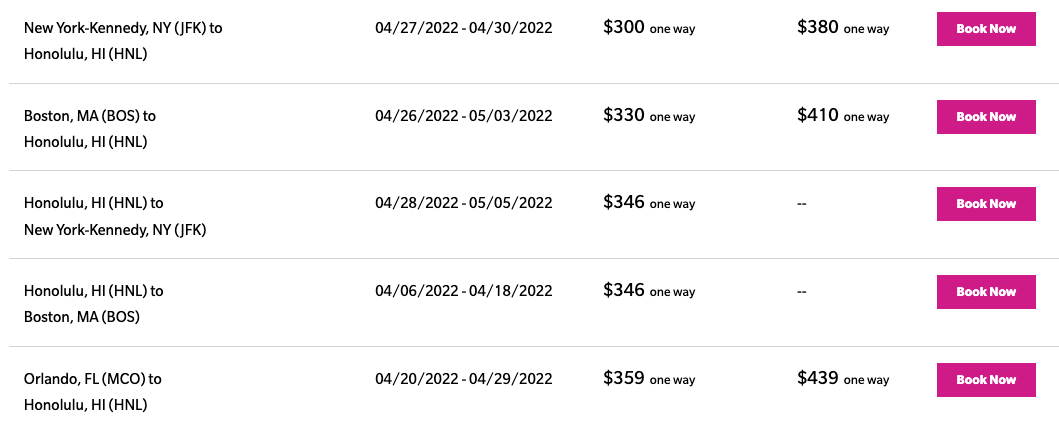 Note that specific routes are limited to certain travel dates within the aforementioned window, so be sure to verify your desired route aligns with your dates of travel. Although significantly more expensive, there is availability flying to Hawaii from the East Coast as well.