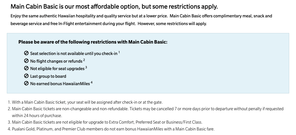 The cheapest flights that are part of this Hawaiian flash sale are for its Main Cabin Basic fare, which only includes one free carry-on bag and a personal item, but does not allow for any ticket changes or refunds outside of the first 24 hours of purchase.