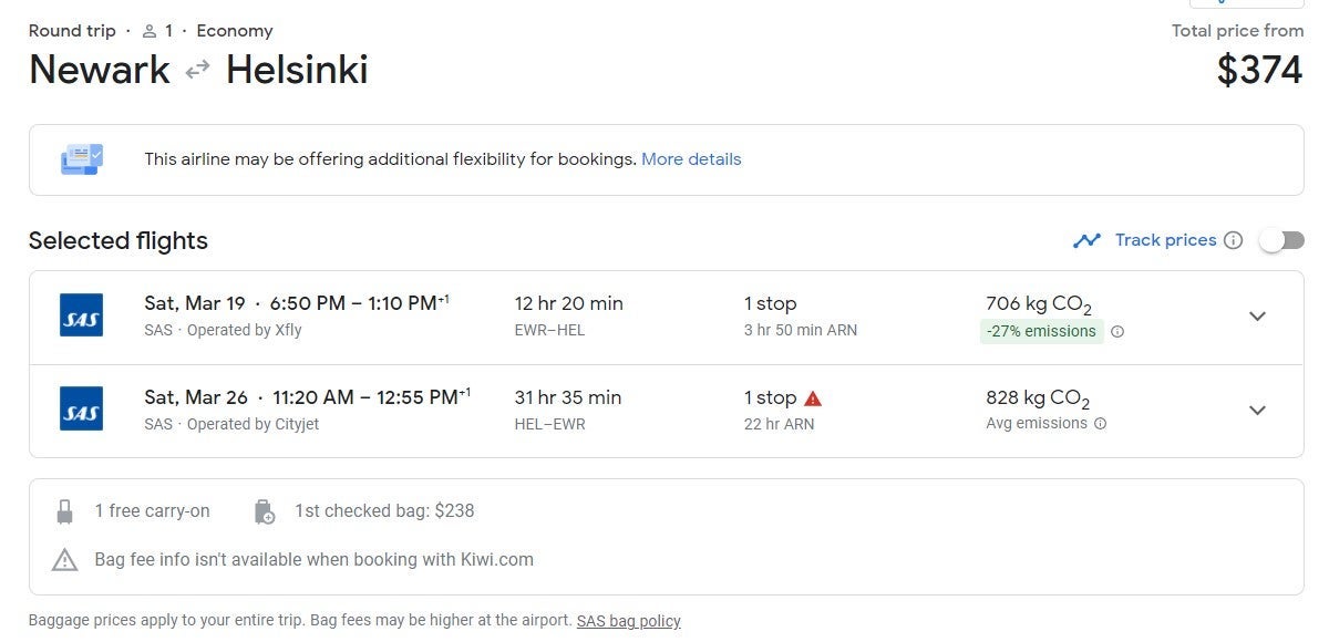 For a few bucks more, New Jersey residents can snag a flight from Newark (EWR) to Helsinki (HEL) for $374 round-trip with a layover in Stockholm (ARN) on the departure and almost a full day there on the return flight.