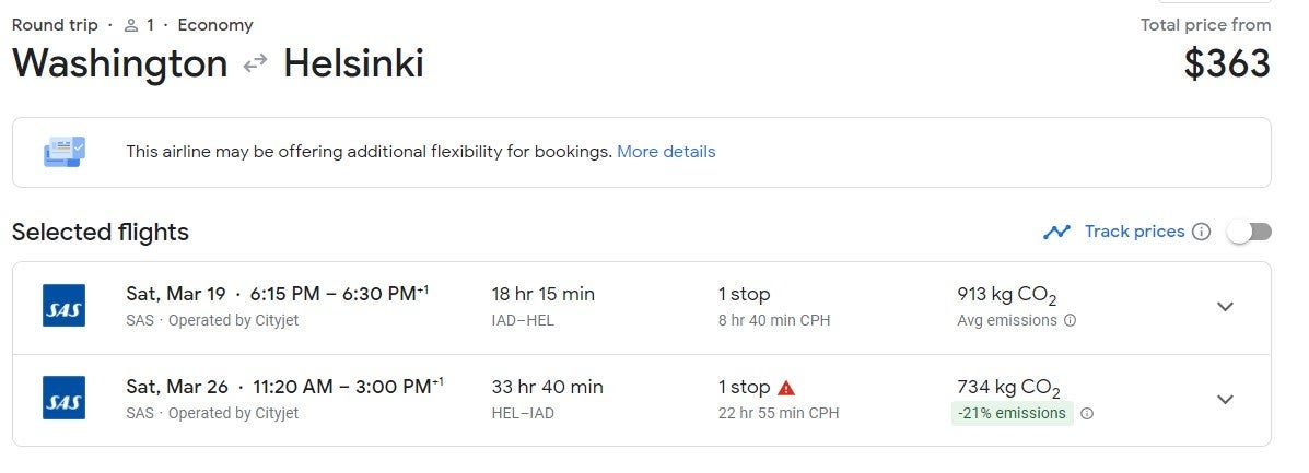 One of the most affordable deals includes a flight from Washington, D.C. (IAD) to Helsinki (HEL) for $363 round-trip in March. This low fare includes long layovers in Copenhagen (CPH) each way so be aware of that before booking.