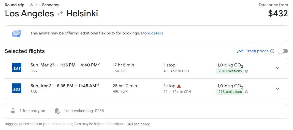 We found a $432 fare for travel from Los Angeles (LAX) to Helsinki (HEL) in late March with a return in early April for $432 round-trip. It includes layovers in Copenhagen (CPH) each way.