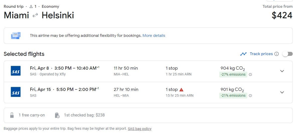 You can book a trip in early April from Miami (MIA) to Helsinki (HEL) for $424 round-trip, also with a stop in Stockholm (ARN) each way.