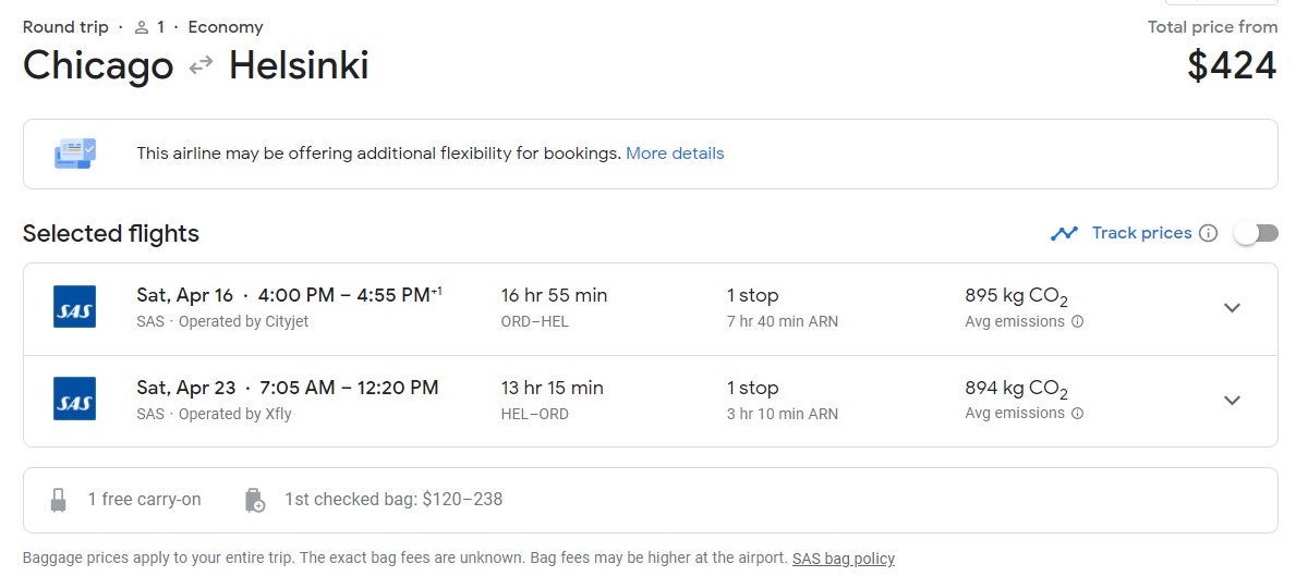 There are flights available from Chicago (ORD) to Helsinki (HEL) at the end of April for the same price of $424 round-trip with stops in Stockholm (ARN).