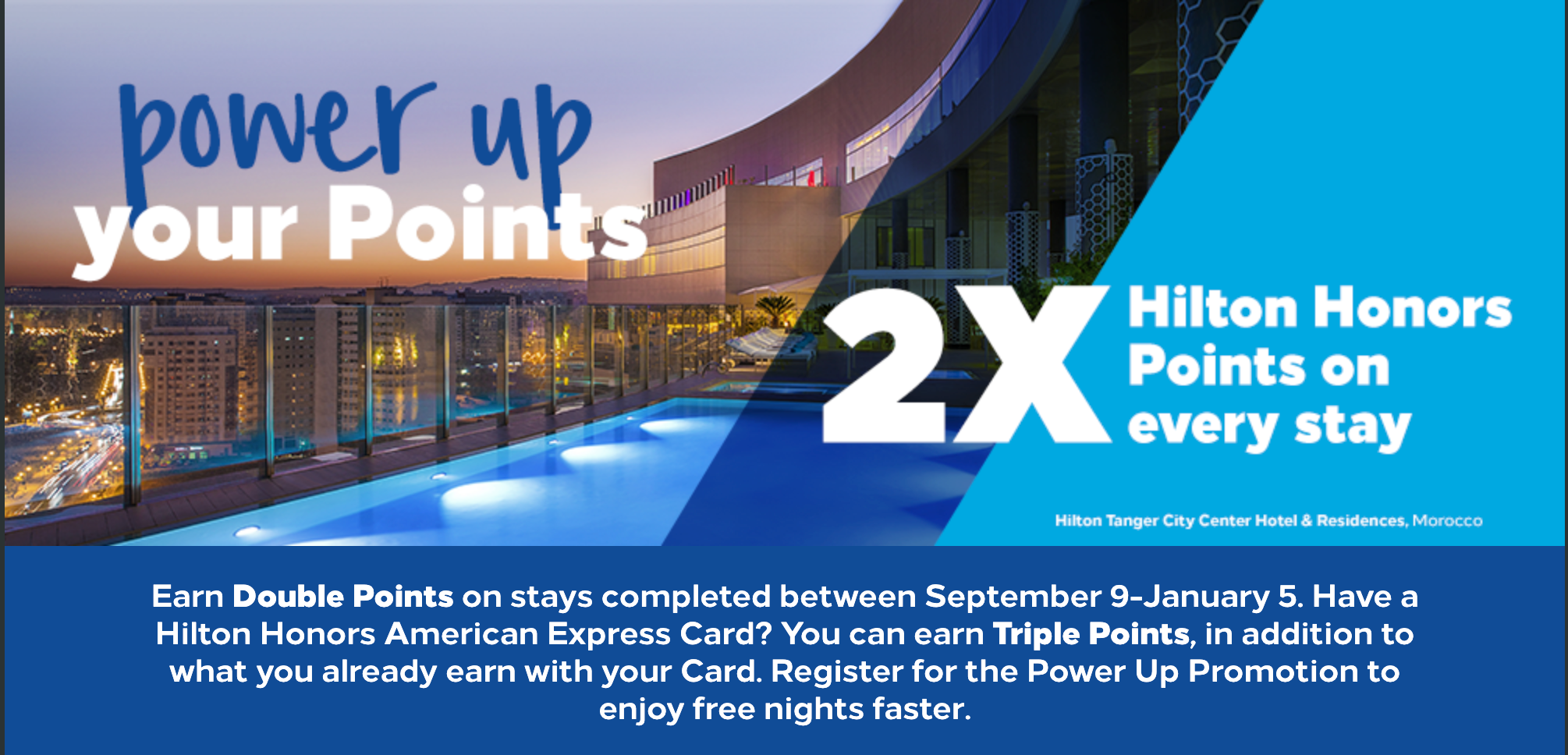 Power Up Your Points will earn Honors members double base points on every stay between September 9 and January 5, 2020. Members who are also cardholders of one of Hilton's co-branded American Express cards can earn triple base points when they book their stay using their Hilton Amex card.