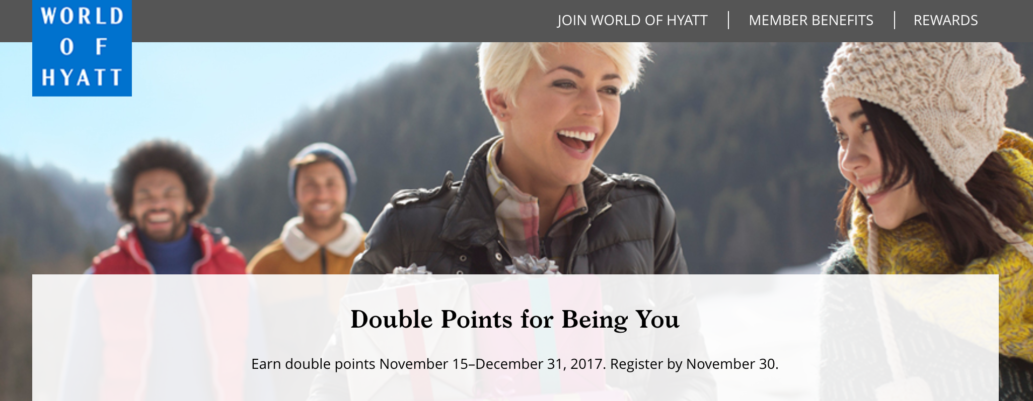 World of Hyatt is offering members the opportunity to earn double points on all stays through the end of the year. With the "Double Points for Being You" promotion, you'll earn double points on stays through December 31, 2017.