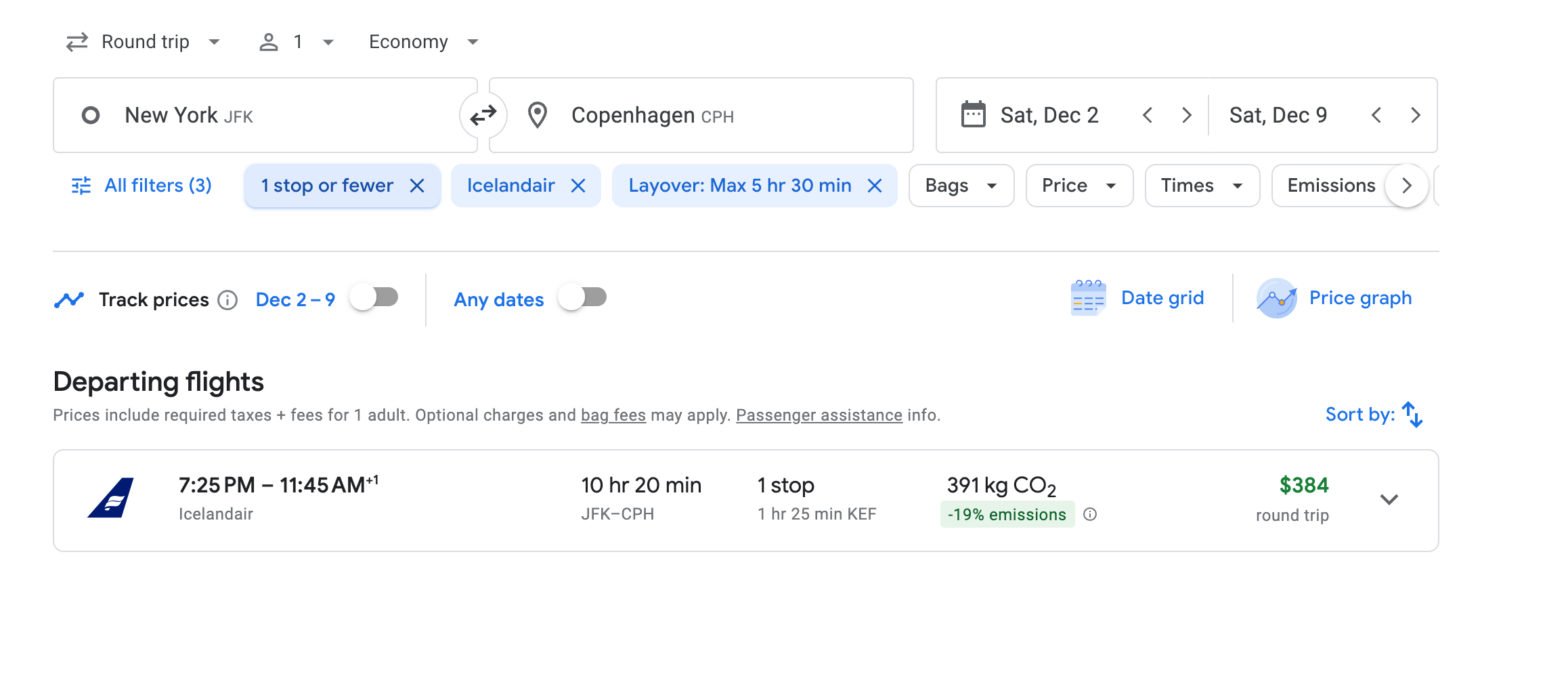 For a December flight to Copenhagen, Icelandair's JFK flight is the cheapest option on Google Flights.